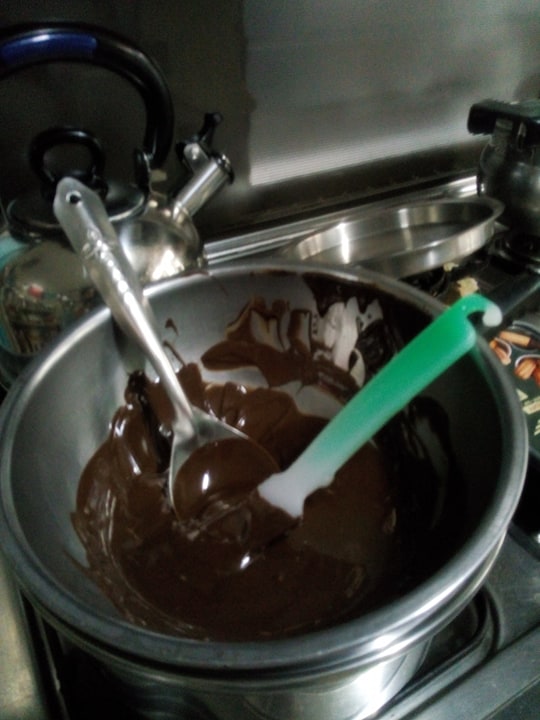 - Melt 1 cup of dark chocolate (your choice of brand) or more over boiling water. (Note: see photo below for the consistency and thickness of the melted chocolate).